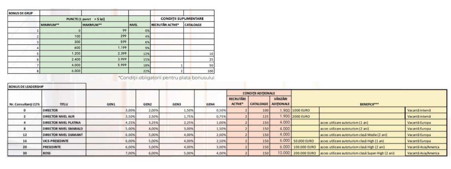 Atunci când de exemplu un Consultant din prima generaţie, atinge nivelul de bonus 22%, adica are volumul de grup de 6000 puncte, bonusul de grup pe care l-ai câştiga în mod normal nu mai există întrucât dispare diferenţa dintre nivelul tău de bonus şi nivelul acestuia 22% – 22% = 0.